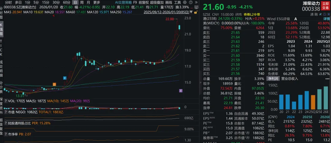 还有一个值得关注的是其成长性对标的巨大潜力。以美国SOFC行业龙头Bloom Energy为例,其在刚刚实现盈利、年营收约1300亿元人民币的阶段,市值已高达约2500亿元人民币。这一对标深刻揭示了,一旦潍柴动力的SOFC、数据中心电源等新业务完成从“概念”到“规模化盈利”的蜕变,市场完全有理由依据其成长属性,给予其远高于传统制造业务的估值水平,从而打开市值的长期上行通道。