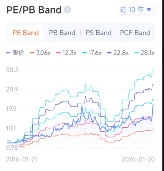 回顾历史估值,其市盈率(PE)的中位数区间大约在12.3倍至17.6倍之间。近期随着股价上涨超过20%,其PE也已升至15.8倍左右,正在向区间上沿17.6倍靠近。从长期看,其估值在过去十年中极少突破22.8倍。