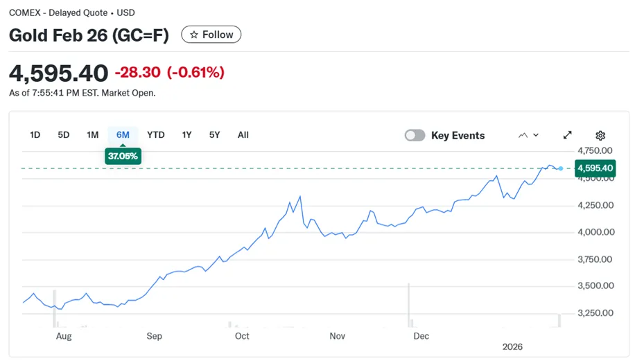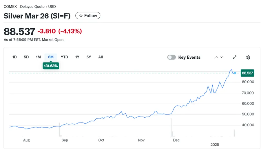 黄金价格周五收于 4,595.40 美元,当日下跌 0.61%,但整体仍明显高于 2025 年末水平。白银价格收于 88.54 美元,当日下跌 4.13%。尽管出现回调,白银在中期维度上仍显著高于此前水平。