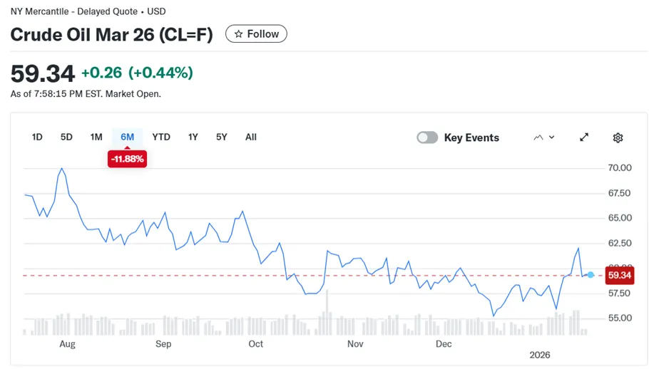 原油价格周五收于 每桶 59.34 美元,当日上涨 0.44%。在经历一周的波动交易后,油价整体小幅收高。