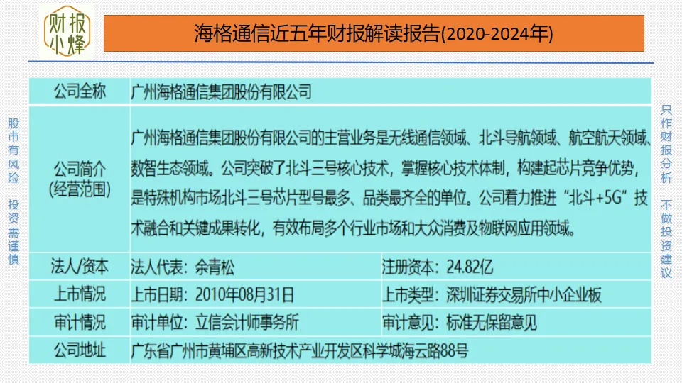 通过上图,我们对海格通信是做什么的、从事什么行业以及做得怎么样有了大概了解。但这些还不够,想要进一步了解该公司,还需要对其财报进行深入分析。财报小烽只分析审计意见为“标准无保留意见”的上市公司,因为该公司的财报真实性和准确性都比较高,朋友们应该远离不是此意见报告的公司。