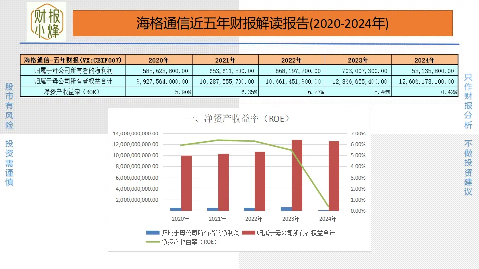 2020年至2024年,海格通信的归母净利润分别为5.86亿元、6.54亿元、6.68亿元、7.03亿元、0.53亿元,净资产分别为99.28亿元、102.88亿元、106.61亿元、128.67亿元、126.06亿元,净资产收益率分别为5.90%、6.35%、6.27%、5.46%、0.42%,一直低于15%,股东回报如细流汇海,微薄难显。
