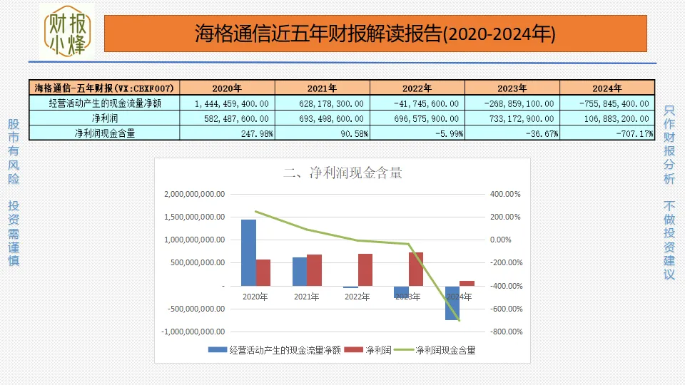 2020年至2024年,海格通信的净利润分别为5.82亿元、6.93亿元、6.97亿元、7.33亿元、1.07亿元,净利润现金含量分别为247.98%、90.58%、-5.99%、-36.67%、-707.17%,整体低于100%,现金创造能力如枯井取水,所获寥寥。