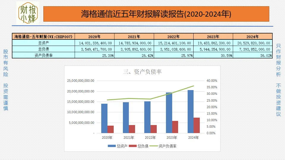 2020年至2024年,海格通信的总资产分别为140.31亿元、147.84亿元、152.14亿元、194.34亿元、205.30亿元,总负债分别为35.49亿元、39.06亿元、39.51亿元、59.44亿元、73.94亿元,资产负债率分别为25.30%、26.42%、25.97%、30.59%、36.02%,一直低于60%,且呈缓升趋势,偿债风险可控,财务结构如老树盘根,虽遇风摇,根基尚稳。
