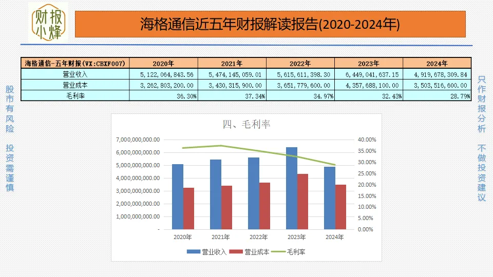2020年至2024年,海格通信的营业收入分别为51.22亿元、54.74亿元、56.16亿元、64.49亿元、49.20亿元,营业成本分别为32.63亿元、34.30亿元、36.52亿元、43.58亿元、35.04亿元,毛利率分别为36.30%、37.34%、34.97%、32.43%、28.79%,整体高于30%但逐年下滑,产品竞争力如夕阳西下,光辉渐褪。