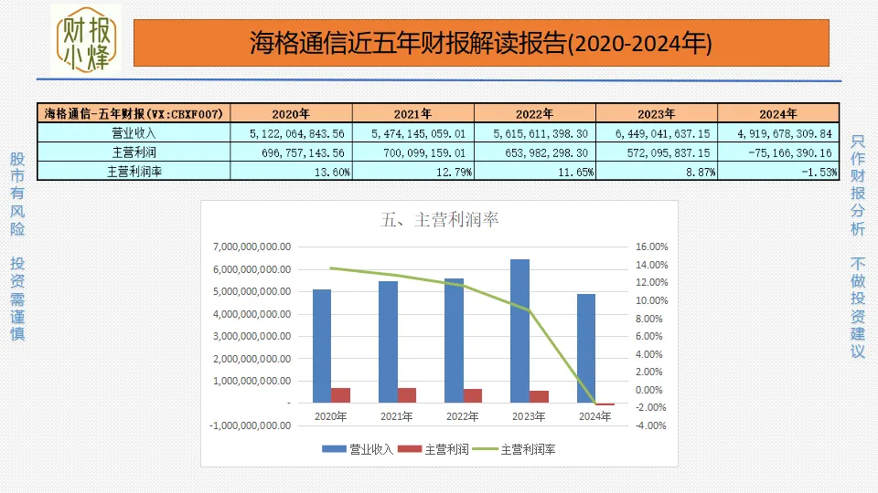 2020年至2024年,海格通信的主营利润分别为6.97亿元、7.00亿元、6.54亿元、5.72亿元、-0.75亿元,主营利润率分别为13.60%、12.79%、11.65%、8.87%、-1.53%,整体低于15%,核心盈利如旱地行舟,步履维艰。