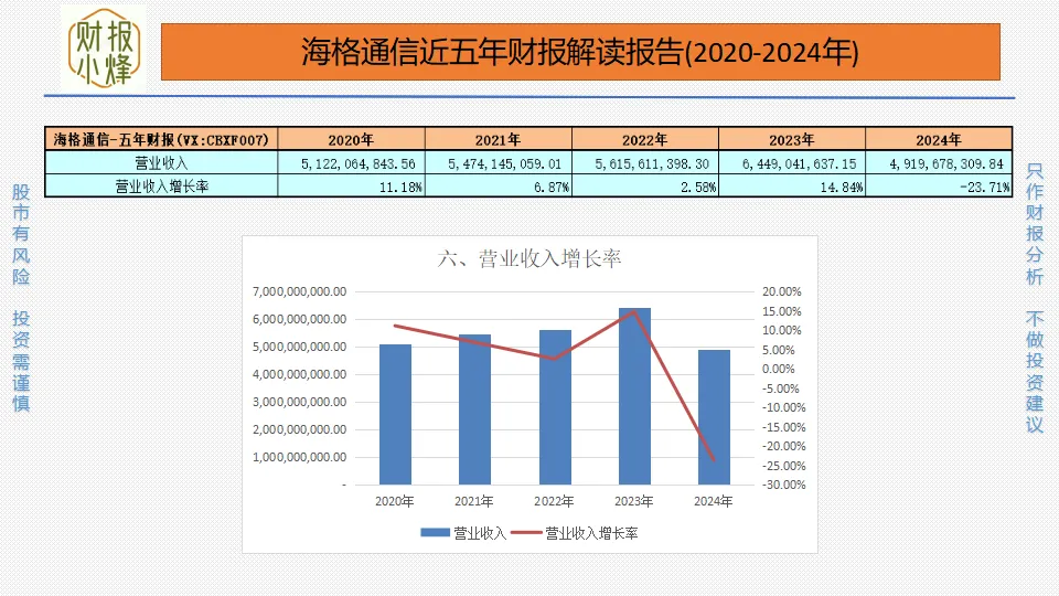 2020年至2024年,海格通信的营业收入分别为51.22亿元、54.74亿元、56.16亿元、64.49亿元、49.20亿元,营业收入增长率分别为11.18%、6.87%、2.58%、14.84%、-23.71%,波动剧烈,2024年转负,成长性如风中残烛。
