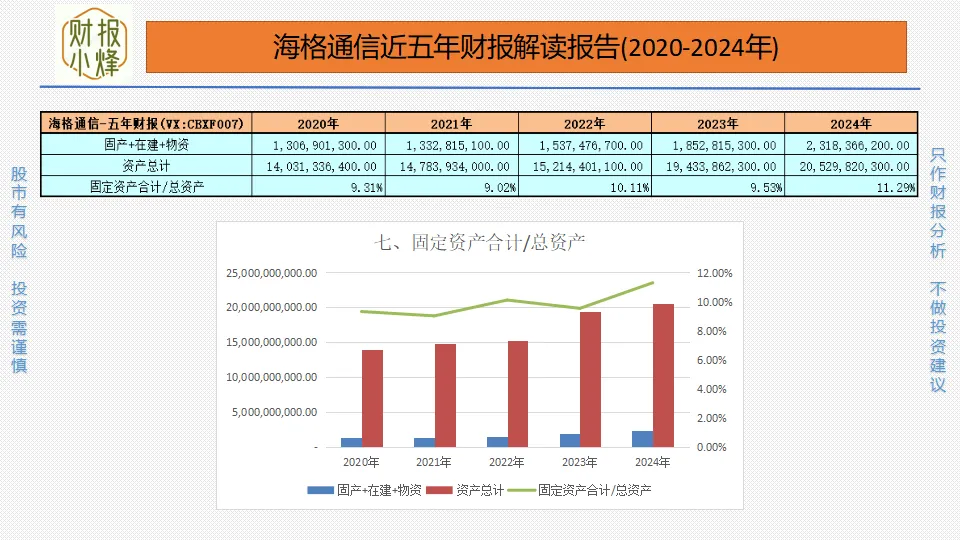 2020年至2024年,海格通信的固定资产与在建工程、工程物资合计分别为13.07亿元、13.33亿元、15.37亿元、18.53亿元、23.18亿元,其合计占总资产比值分别为9.31%、9.02%、10.11%、9.53%、11.29%,一直低于40%,属轻资产运营,结构灵活。