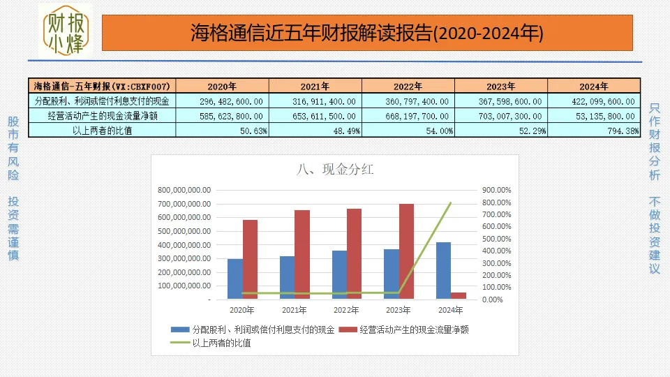 2020年至2024年,海格通信的现金分红金额分别为2.96亿元、3.17亿元、3.61亿元、3.68亿元、4.22亿元,现金分红率分别为50.63%、48.49%、53.99%、52.29%、794.38%,整体高于50%,分红慷慨,股东回报如春风送暖,心意满满。