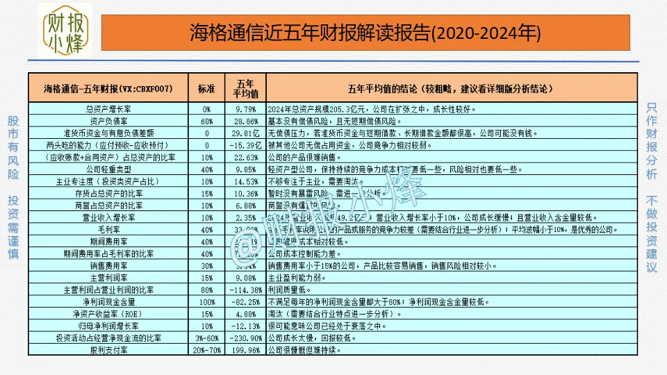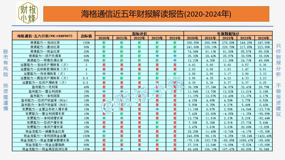 以上是八个关键财务指标的分析,只能判断大概方向,想要对海格通信进行深层次的了解,我们还应该整体分析21个财务指标,这里为了给大家节约时间,小烽特将海格通信的21个财务指标整体情况做了两张图表提供给大家。