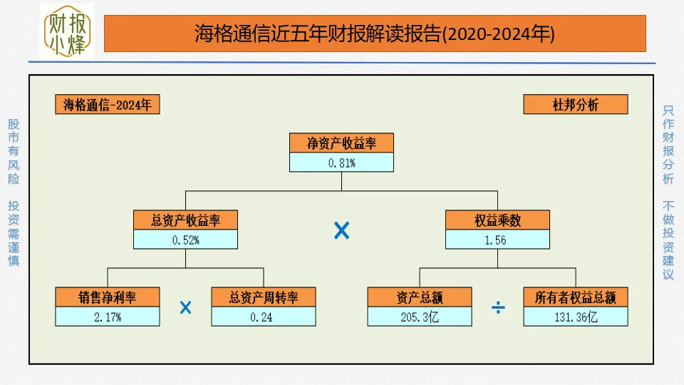 海格通信2024年的销售净利率为2.17%,说明公司的销售净利率非常低,公司的产品不好,盈利能力非常弱,属于低销售净利率的公司;海格通信2024年的总资产周转率为0.24,说明公司的管理效率非常低,资金运营的效率也非常低,属于低总资产周转的公司;海格通信2024年的权益乘数为1.56,说明公司的财务杠杆较低,负债较低,财务风险也较低,属于低杠杆公司;总之,海格通信公司属于低销售净利率低资产周转率低杠杆公司。