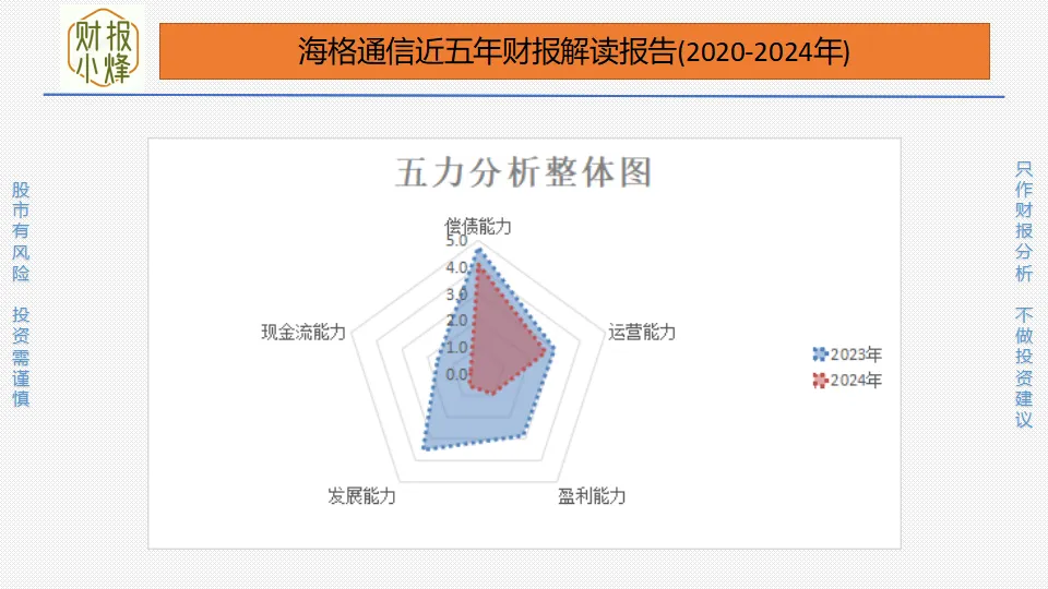 海格通信的偿债能力与去年同期相比略有下降,由高水平下降至中高水平;运营能力与去年同期相比略有下降,由中等水平下降至中低水平;盈利能力与去年同期相比明显下降,由中等水平下降至低水平;发展能力与去年同期相比大幅下降,由中等水平下降至低水平;现金流能力与去年同期相比明显下降,但仍保持在低水平;整体来看“五力”整体下降。