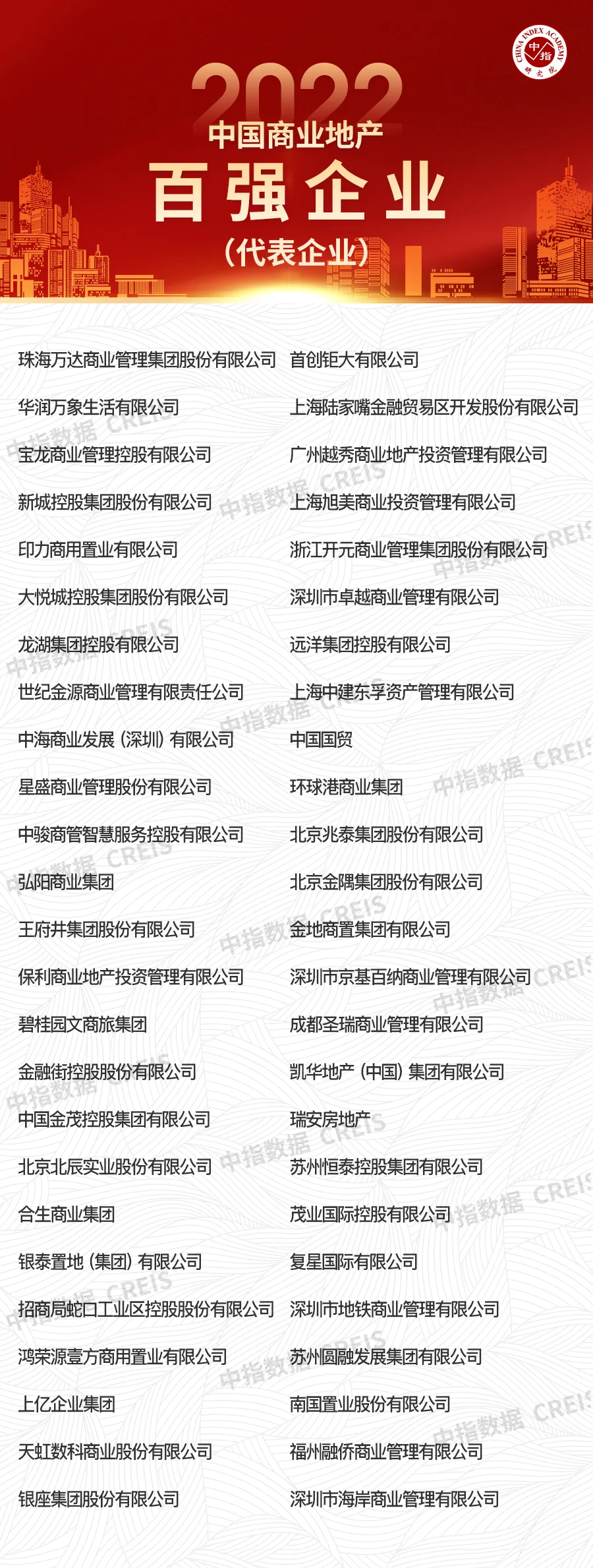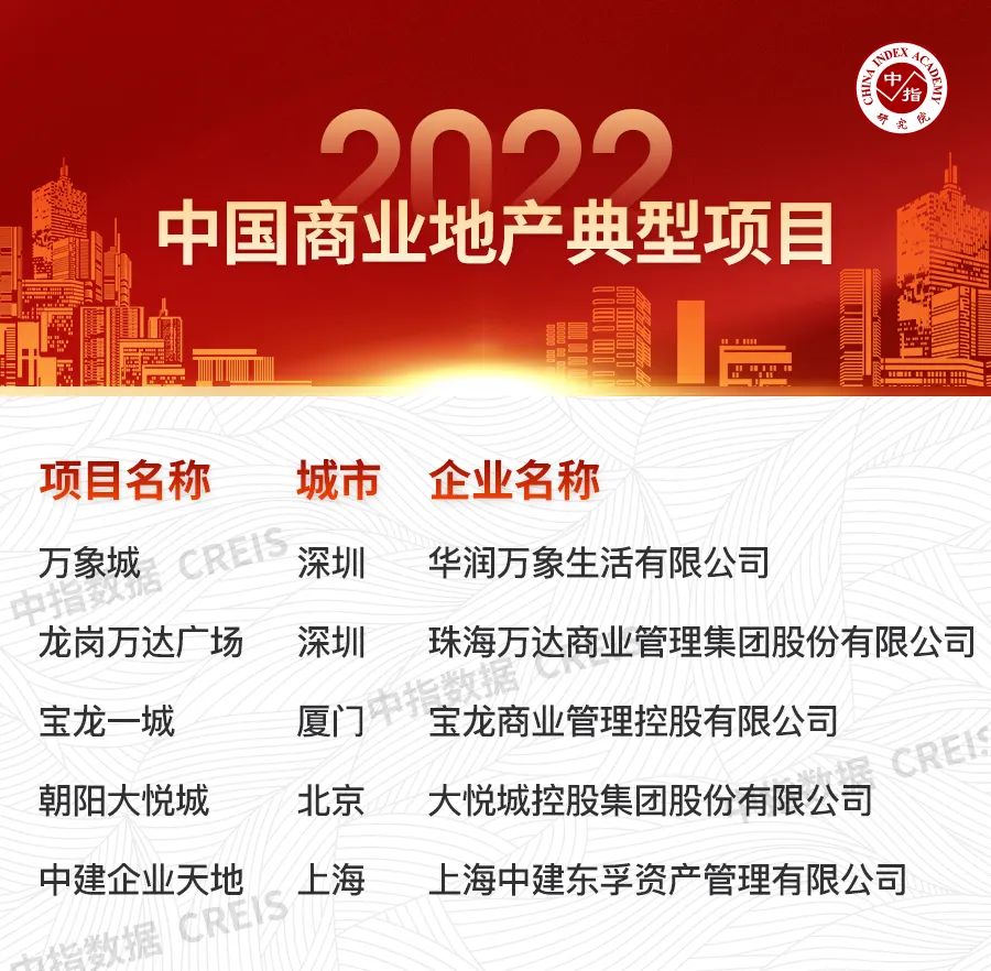 2022年,中指研究院结合在商业地产领域多年的研究积累与数据基础,启动“2022中国商业地产百强企业”研究,发掘行业中综合实力强、成长潜力大、经营稳健、社会责任感强的优秀商业地产企业群体,鼓励企业在客观认识商业地产发展现状及行业变化趋势的基础上,不断提高企业管理运营水平,促进行业平稳健康发展。(文末查看完整版报告获取方式)