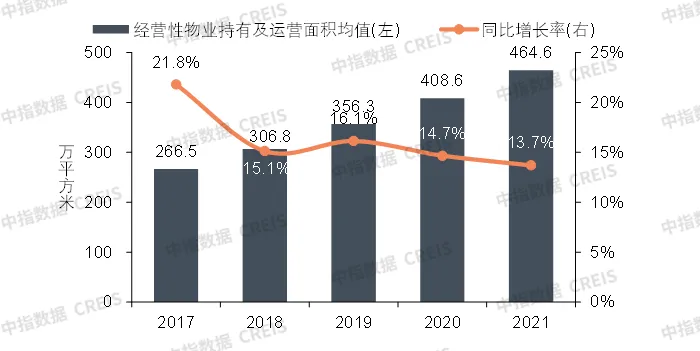 受局部疫情冲击等多重因素影响,商办市场供需两端均偏弱,而商业地产百强代表企业凭借较强的运营能力及资金优势,经营性物业持有及运营规模保持增长态势,但增速小幅放缓。2021年,商业地产百强代表企业经营性物业持有及运营面积均值为464.6万平方米,同比增长13.7%,增幅较2020年收窄1.0个百分点。