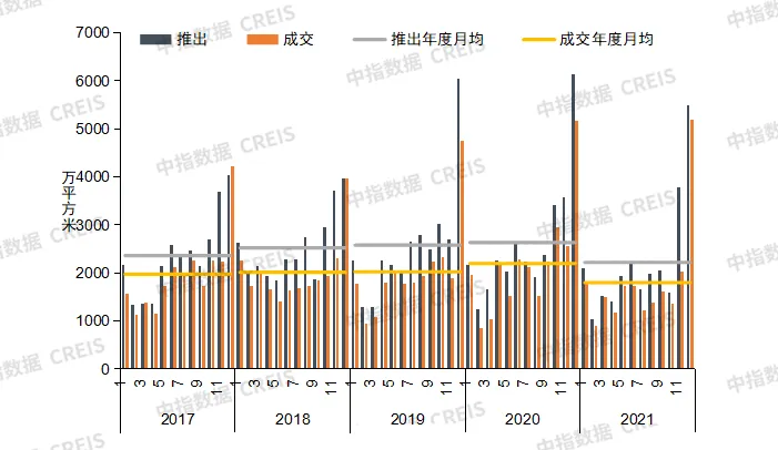 2021年,受多重因素叠加影响,房地产行业进入调整通道,企业资金回笼明显受阻,叠加部分企业债务违约导致行业信用受损,企业融资不畅,资金压力明显增加下,房企拿地趋于谨慎;同时,商办市场整体存量较大,进一步制约商办用地市场的活跃度。