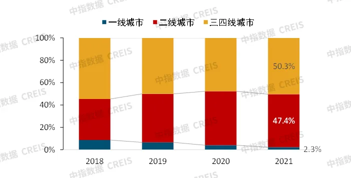 在需求趋弱以及资金压力增加等因素影响下,商业地产企业投资布局更趋谨慎。2021年,商业地产百强代表企业平均新增纯商办用地规模较2020年明显收缩。从新增商办用地分布看,百强代表企业新增商办用地在一线城市的占比下降1.8个百分点至2.3%,二线城市占比下降0.8个百分点至47.4%,三四线城市占比增加2.6个百分点至50.3%。