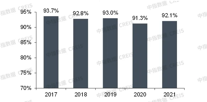 百强代表企业着力提升项目经营品质,重点项目的经营情况整体保持稳定,平均出租率小幅提升。2021年,商业地产百强代表企业重点项目经营情况稳定,平均出租率为92.1%,较2020年上升0.8个百分点。