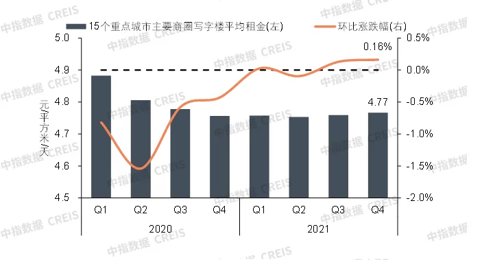 2020-2021年全国重点城市主要商圈写字楼平均租金及环比变化
