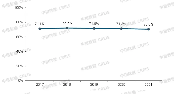 商业地产百强代表企业资产负债率小幅下降,位于合理区间。2021年,商业地产百强代表企业资产负债率均值为70.6%,较2020年小幅下降0.7个百分点。总体来看,商业地产百强代表企业积极降负债的同时,通过稳步的规模扩张和高质量运营带来的收入提升扩大资产规模,实现稳健经营。