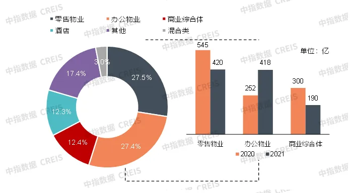 从底层资产来看,零售物业、办公物业、商业综合体依旧是发行数量最多的资产类型。其中,以办公物业为底层资产的产品发行量为418亿,占总发行量的27.4%,占比较2020年上升超10个百分点。