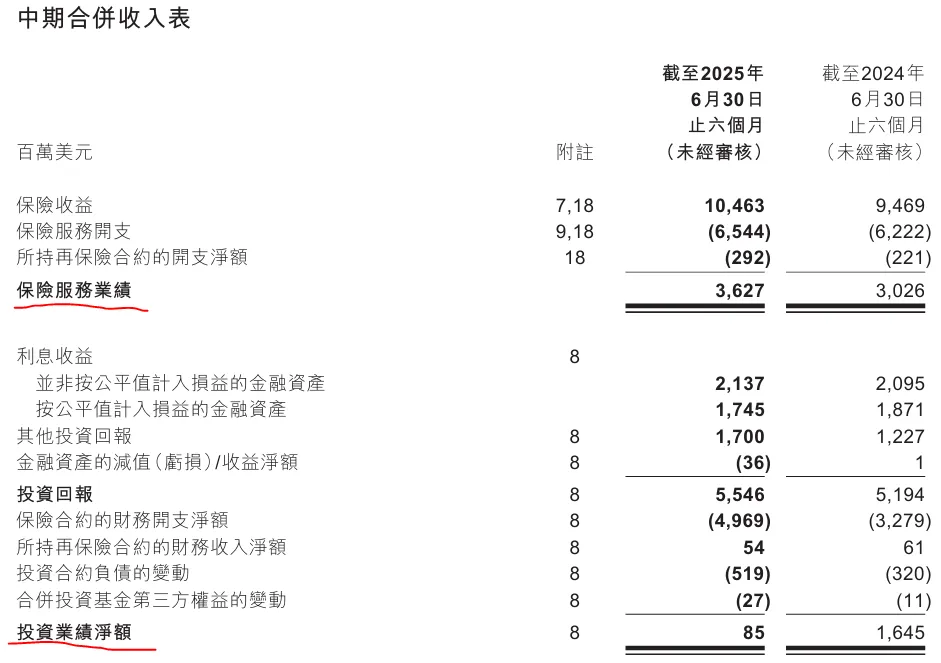 而友邦的利润表和同样港股上市的太平一样,归类了。非常清晰地列出了两大利润来源的情况,那就是保险服务业绩和投资业绩,如下图: