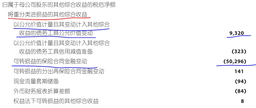 上图中我标蓝色的就是其中最重要的两个部分,第一部分就是FVOCI-债权的公允价值变动,第二部分友邦叫做“保险合约的财务开支净额”,对应的就是A股报表中的“保险合同金融变动”。下图是平安2025年中报,大家可以比对下: