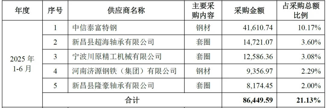 公司采购的主要原材料包括钢材、钢管、锻件等钢材制品,以及滚动体、保持架等轴承部件,建立了长期稳定的供应链合作体系。前五大供应商以钢材生产企业和轴承部件加工企业为主,2022-2025年1-6月,前五大供应商采购金额占比分别为25.56%、23.91%、22.36%、21.13%,集中度逐年下降,不存在对单一供应商的重大依赖。