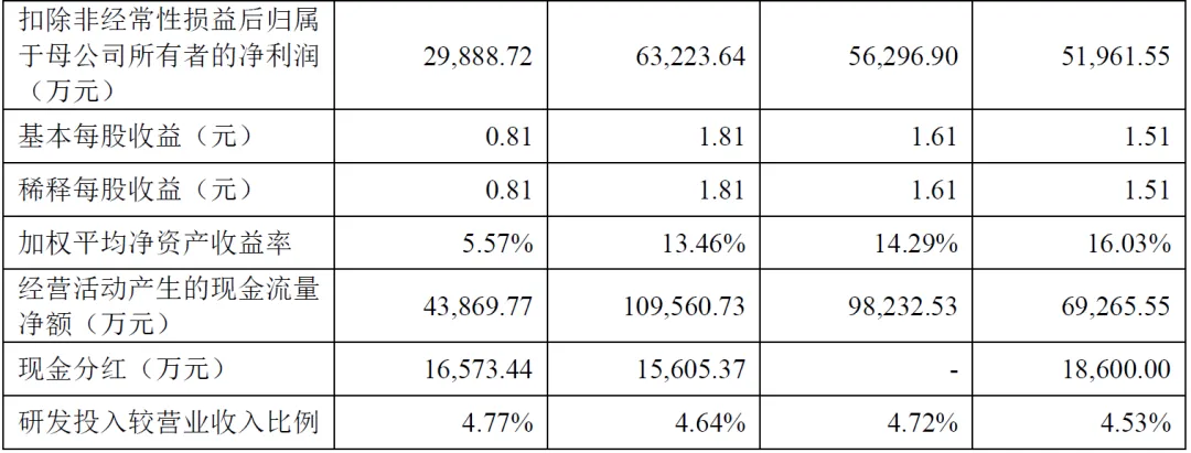 盈利能力指标方面,2022-2025年1-6月,主营业务毛利率分别为27.69%、27.13%、27.18%、25.79%,整体保持稳定,体现公司产品较强的定价能力和成本控制能力。研发投入占营业收入比例分别为4.53%、4.72%、4.64%、4.77%,持续高研发投入为技术创新和产品升级提供保障。