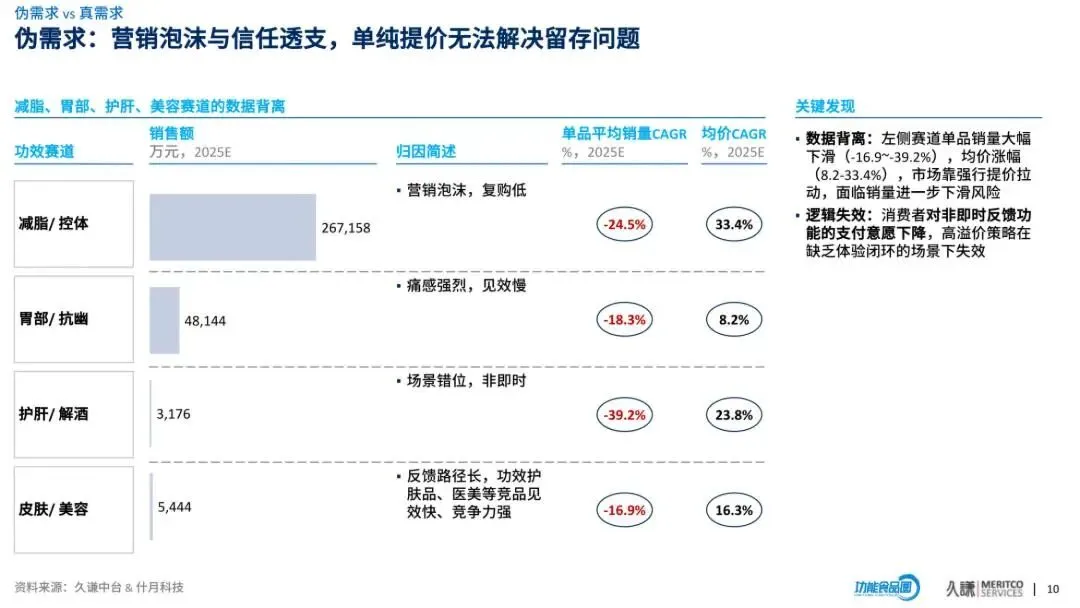 功效细分呈现明显分化:三高 / 血糖、孕产等赛道量价齐升成 “高潜明星”;减脂、护肝等靠提价维持增长,存在 “价格泡沫”;口腔护理以价换量成效显著;私密、儿童等赛道陷入 “量价双杀”。复配是核心增长引擎,但需遵循 “系统算力优化” 逻辑,肠道 + 减脂、肠道 + 三高为黄金组合,而胃部 + 减脂等违背生理直觉的组合则成 “死亡禁区”。部分赛道如运动、口腔更适合单一功效,追求纯粹性与便携性。