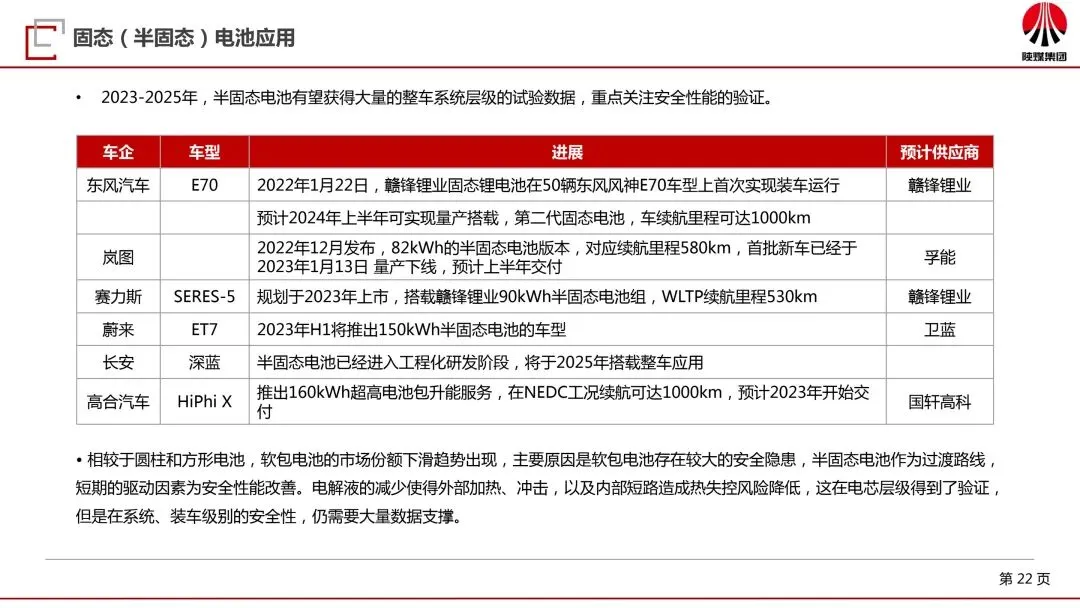 行业正处于半固态向全固态过渡阶段。预计2025年混合固液电池将实现产业化,全固态电池则有望在2030年后逐步推广。蔚来、东风、岚图等车企已开始搭载半固态电池试运行。