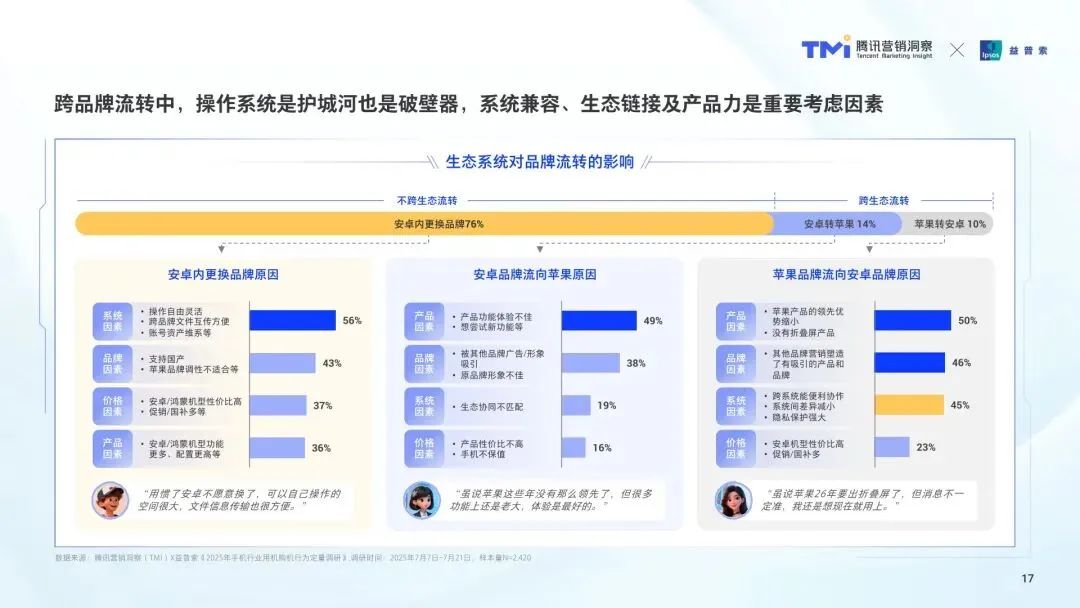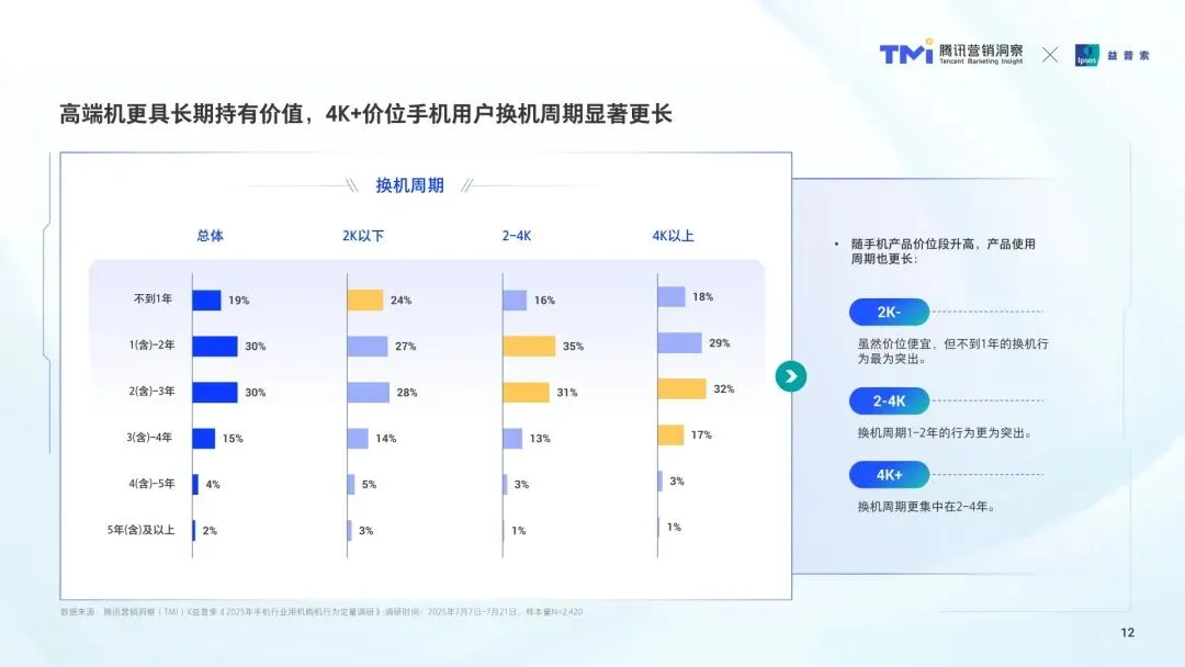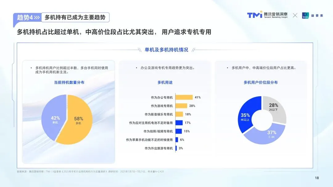 市场结构升级,高端化与新品类双轮驱动。4K + 价位段份额近三成,且换机周期更长(集中在 2-4 年),影像体验、旗舰配置、国补优惠是升档主因。折叠屏虽当前持机比例仅 1.5%,但潜在购机意愿达 35%,大折叠占主导,小折叠 / 阔折叠受新体验需求驱动,用户愿为创新形态与应用效率买单,苹果用户因缺乏折叠屏产品转向安卓阵营。 用户行为变迁,多机持有与品牌流动成常态。58% 的新购用户为多机持有者,41% 将手机作为办公专用机,28% 作为游戏专用机,中高端价位段 “专机专用” 特征更突出。93% 的用户愿意考虑未使用过的品牌,53% 在换机时更换品牌,产品创新力、生态互联能力、外观设计是主要吸引因素,安卓与 iOS 系统间的跨生态协同需求上升。 购机路径重构,线上全流程与微信生态凸显价值。33% 的用户完整经历 “新机发布 - 种草 - 购买” 全流程,线上渠道占比达 60%,微信生态(朋友圈、视频号、公众号)成为新机认知核心渠道,且随价位段提升,微信渠道购机偏好度越高。品牌官方、达人 / 名人、社交口碑、专业媒体是激发兴趣的四大关键角色,长短视频是最优种草形式。 价位段需求分化,营销需精准适配用户特征。4K + 用户关注影像、AI 功能与售后会员服务,偏好新机发布会与权威证言,折叠屏用户更看重产品独特性与社交热度;2-4K 用户兼顾性价比与话题性,影像、游戏是核心场景,决策链条长,需多渠道对比;2K - 用户追求高性价比与耐用性,轻娱乐场景为刚需,品牌忠诚度更高,受官方广告与达人推荐影响显著。 营销逻辑升级,心智占领与场景化种草成关键。品牌需通过 “洞察诊断 - 机会定位 - 心智占领 - 心智裂变” 四部曲,打造品类第一提及率。4K + 机型需强化 “影像旗舰” 认知,折叠屏需抢占办公、出行场景;2-4K 机型应聚焦兴趣场景种草,借助 IP 与短剧形式激发共鸣;2K - 机型需突出价格优势与垂直场景功效,通过官方渠道与达人矩阵传递价值。