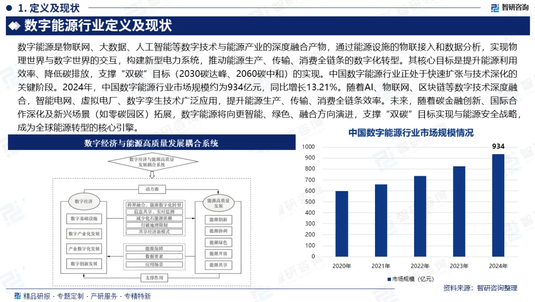市场规模:中国数字能源行业正处于快速扩张与技术深化的关键阶段。2024年,中国数字能源行业市场规模约为934亿元,同比增长13.21%。随着AI、物联网、区块链等数字技术深度融合,智能电网、虚拟电厂、数字孪生技术广泛应用,提升能源生产、传输、消费全链条效率。未来,随着碳金融创新、国际合作深化及新兴场景(如零碳园区)拓展,数字能源将向更智能、绿色、融合方向演进,支撑“双碳”目标实现与能源安全战略,成为全球能源转型的核心引擎。
