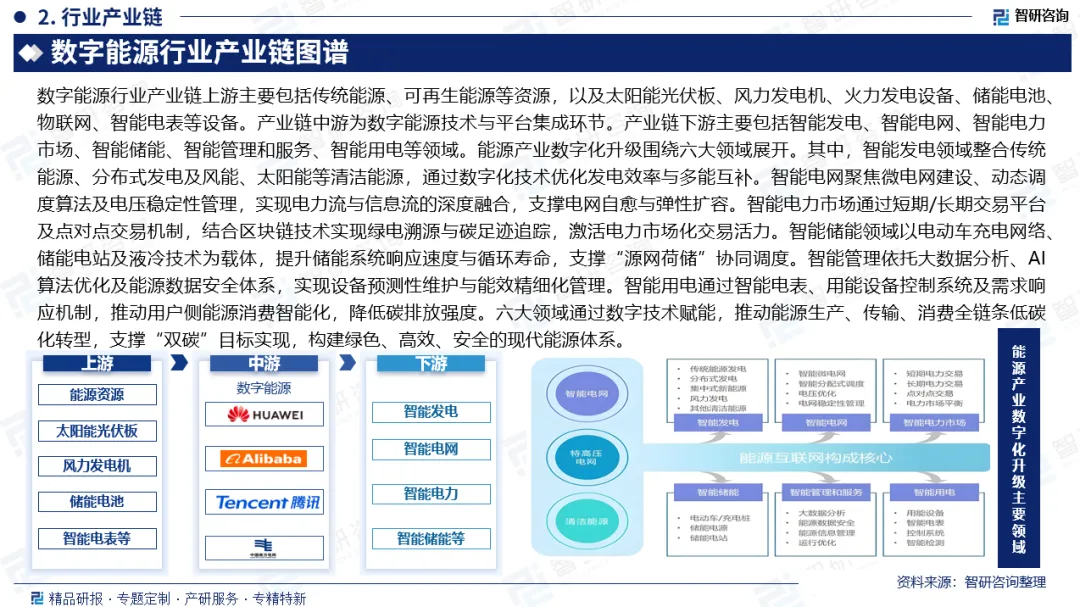 产业链核心节点:能源产业数字化升级围绕六大领域展开。其中,智能发电领域整合传统能源、分布式发电及风能、太阳能等清洁能源,通过数字化技术优化发电效率与多能互补。智能电网聚焦微电网建设、动态调度算法及电压稳定性管理,实现电力流与信息流的深度融合,支撑电网自愈与弹性扩容。智能电力市场通过短期/长期交易平台及点对点交易机制,结合区块链技术实现绿电溯源与碳足迹追踪,激活电力市场化交易活力。智能储能领域以电动车充电网络、储能电站及液冷技术为载体,提升储能系统响应速度与循环寿命,支撑“源网荷储”协同调度。智能管理依托大数据分析、AI算法优化及能源数据安全体系,实现设备预测性维护与能效精细化管理。智能用电通过智能电表、用能设备控制系统及需求响应机制,推动用户侧能源消费智能化,降低碳排放强度。六大领域通过数字技术赋能,推动能源生产、传输、消费全链条低碳化转型,支撑“双碳”目标实现,构建绿色、高效、安全的现代能源体系。