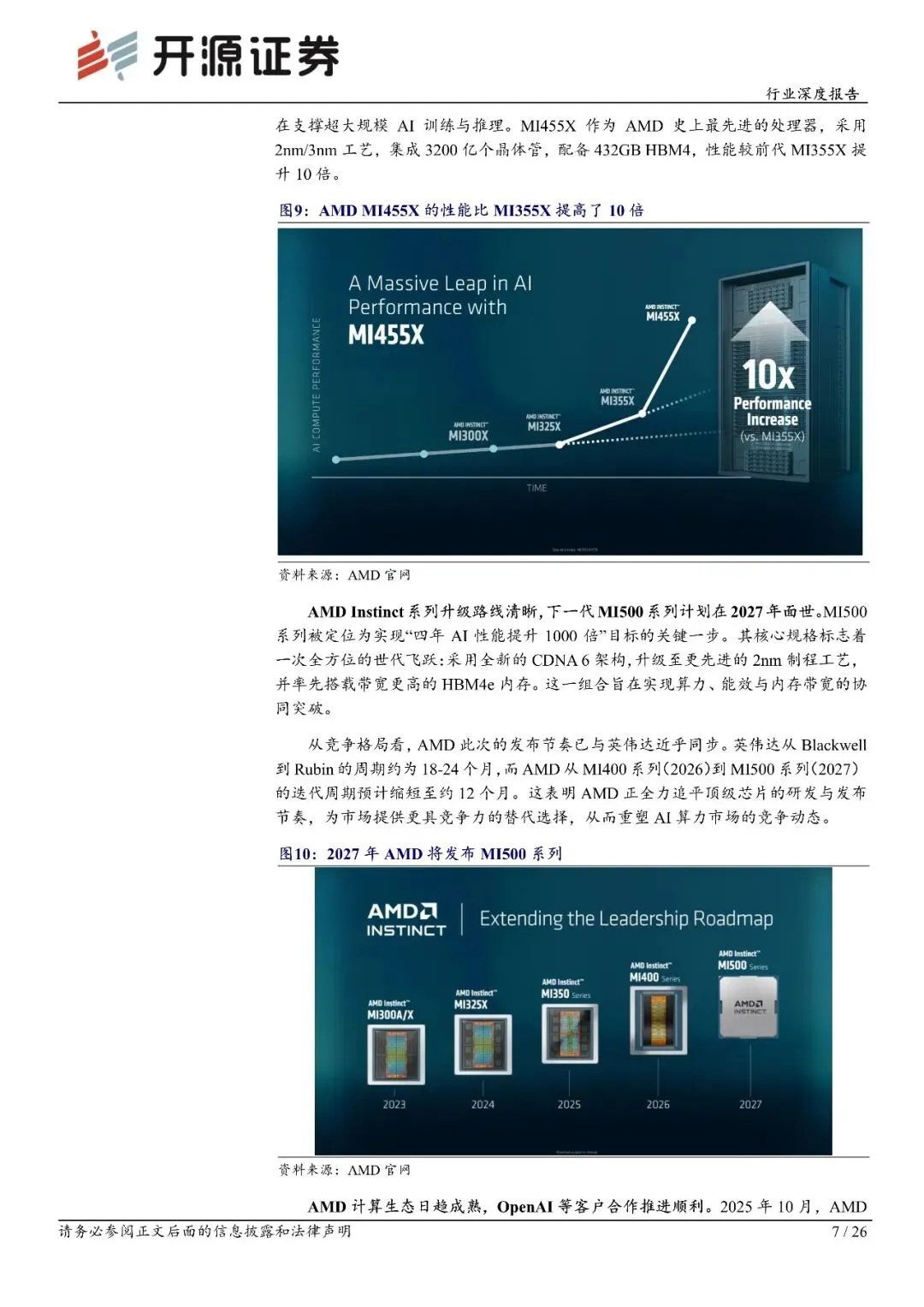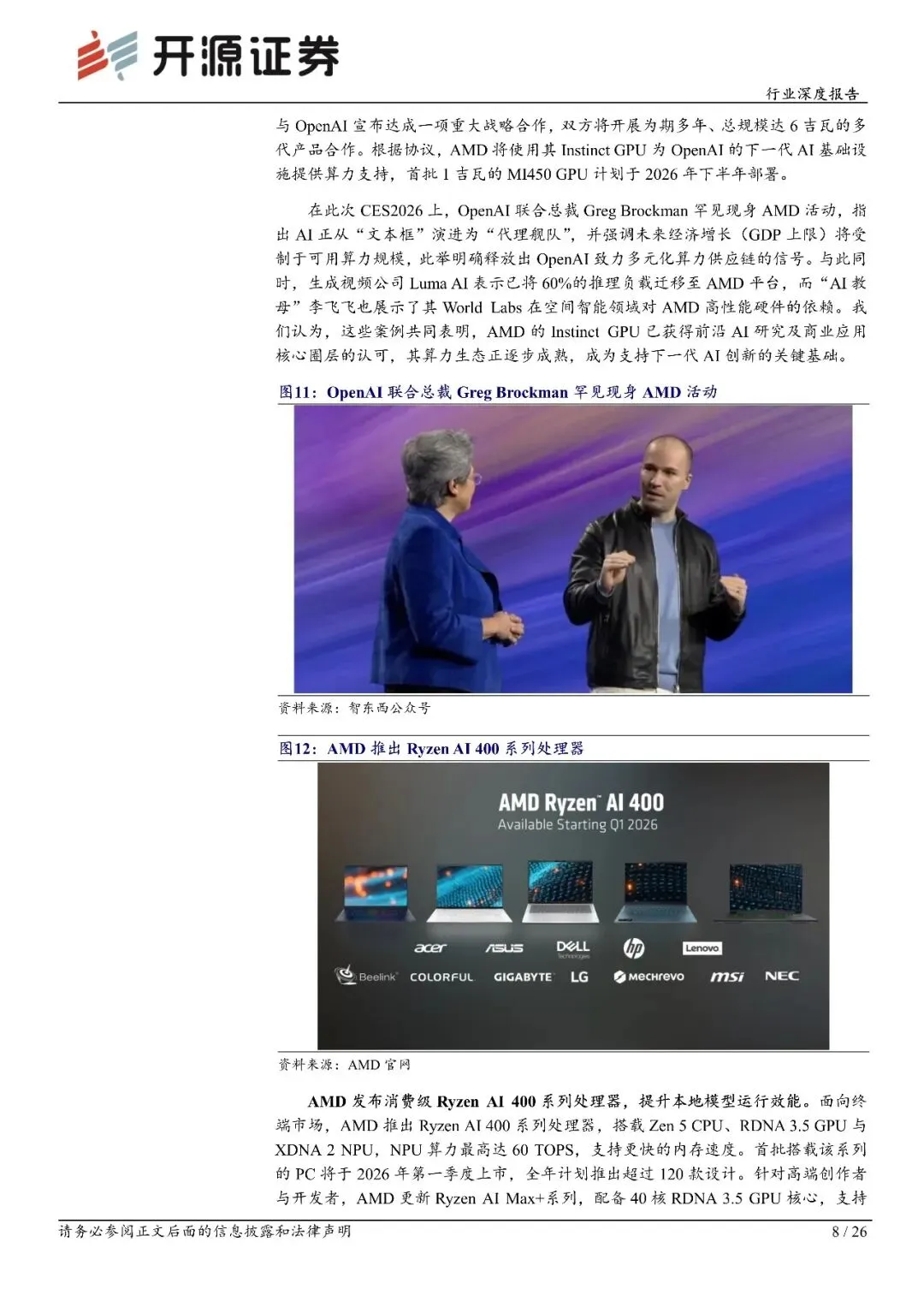 AI 芯片:芯片架构/制程工艺持续迭代,AI 推理能效提升、成本下降AI 芯片方面,CES 2026 英伟达、AMD、英特尔、高通等科技巨头均有亮相。英伟达宣布 Vera Rubin 平台全面投产,Rubin 平台整合 6 颗关键芯片,打造全新的算力、网络与存储架构,在大幅提升性能的同时,AI 推理成本降低 10 倍。AMD展示其全栈 AI 战略,推动全球算力未来进入 YottaFLOPS 级时代,其推出的基于 MI455X 的 AI 平台 Helios 性能较前代提升 10 倍,并获得 OpenAI 等头部客户认可。