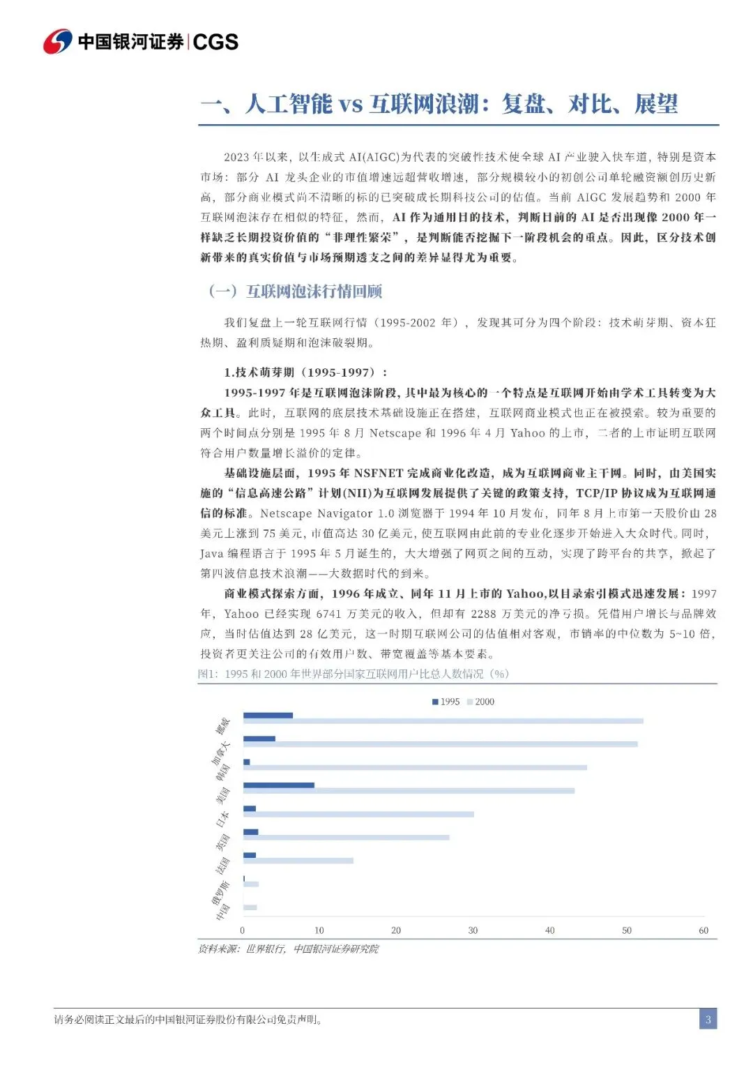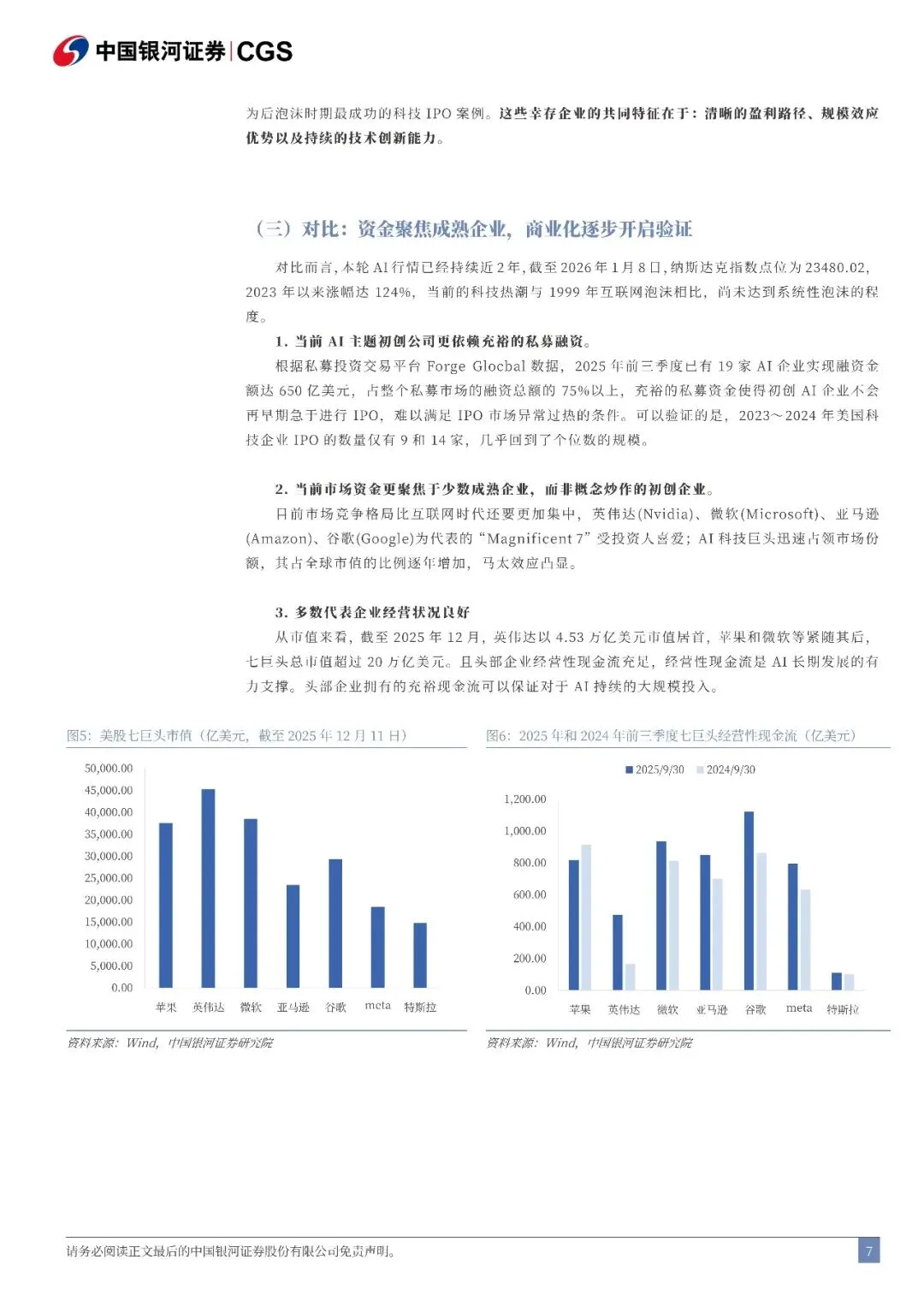 人工智能与互联网浪潮的复盘对比:资金聚焦成熟企业,商业化逐步开启验证 在互联网泡沫时期,IPO 市场异常繁荣,部分公司估值与基本面严重脱节,大量未盈利甚至零收入公司获得极高估值,估值体系严重脱离基本面。在本轮 AI 浪潮中,AI 主题初创公司更依赖充裕的私募融资,而市场资金聚焦于少数经营状况良好的成熟企业,风险相对可控。