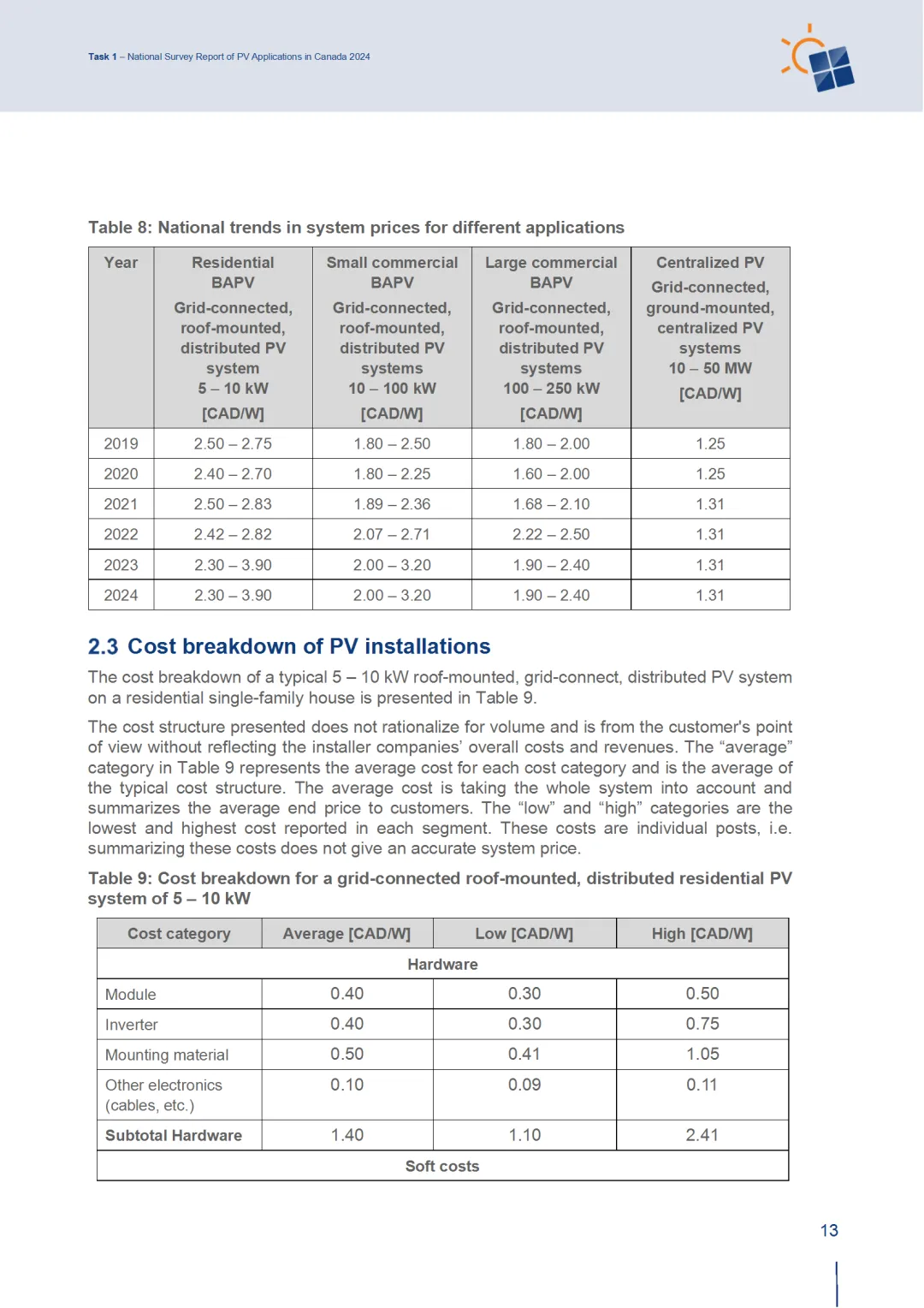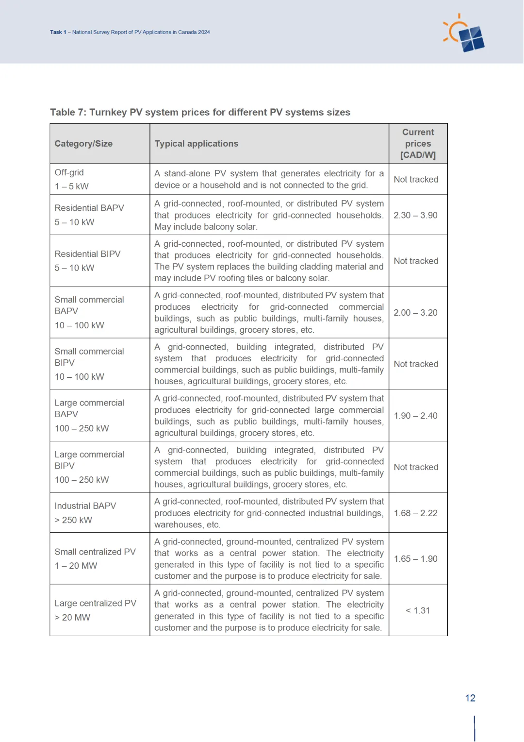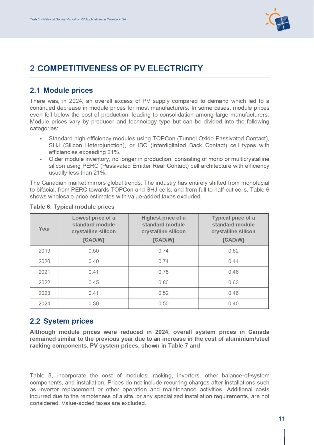 报告强调了加拿大光伏的持续竞争力。尽管2024年组件价格进一步下跌,受全球供过于求和向高效双面组件技术转变推动,但由于机架和系统余裕组件成本上升,整体系统价格较去年基本保持稳定。典型的交钥匙价格在住宅屋顶系统中为2.30至3.90加元/瓦,大型公用事业规模光伏项目则低于1.31加元/瓦。