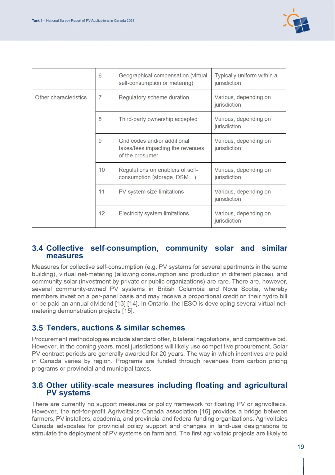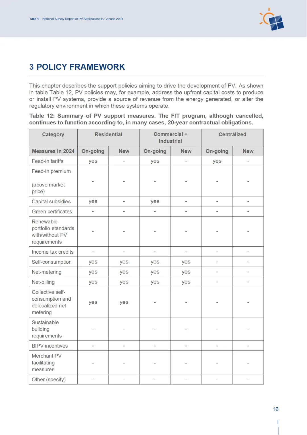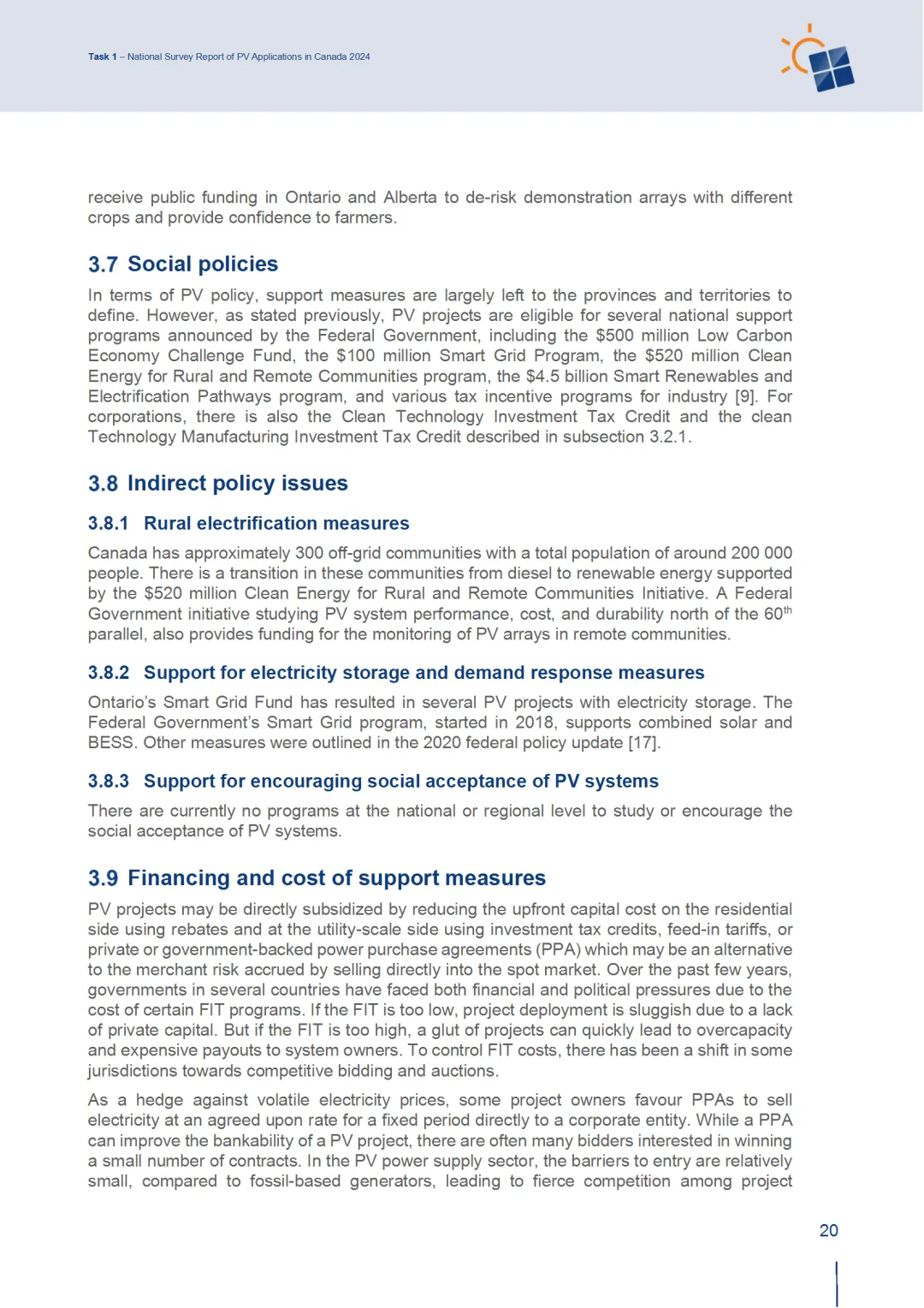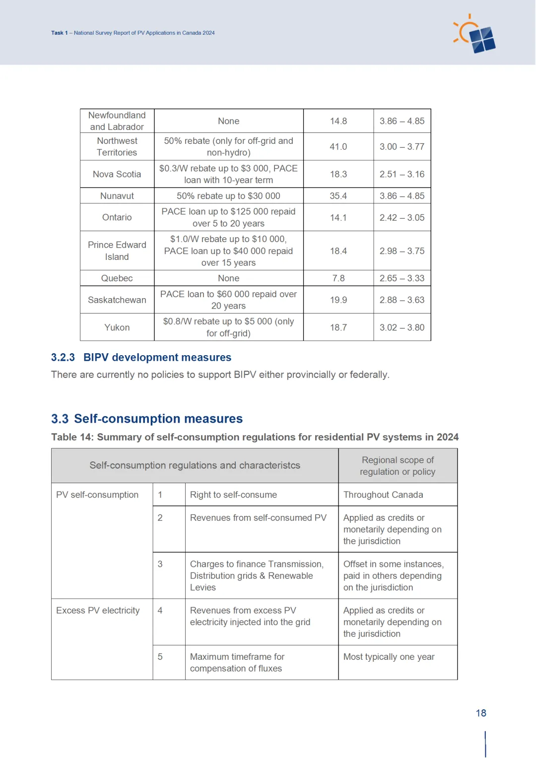 加拿大的光伏政策和市场格局高度分散,省级和地区政府发挥着核心作用。2024年,光伏部署继续通过净计量、资本补贴、税收激励和社区太阳能项目的支持,同时结合清洁技术投资税收抵免等联邦投资工具。报告还指出,社区拥有的光伏项目兴趣日益增长,尤其是在新斯科舍省和不列颠哥伦比亚省等省份。