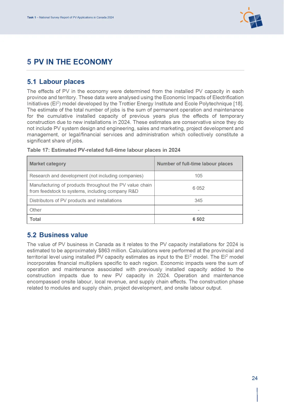 从经济角度看,光伏继续促进就业和工业活动。2024年,加拿大光伏行业估计支持了6,500个全职岗位,主要集中在制造、安装及相关服务领域,而与光伏安装相关的总营业额约为8.63亿加元。