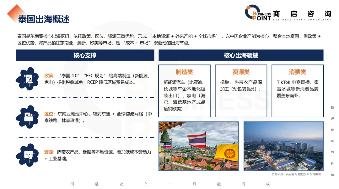 泰国是东南亚核心出海枢纽,依托政策、区位、资源三重优势,形成 “本地资源 + 外来产能 + 全球市场” ,以中国企业产能为核心,整合本地资源,借政策 + 区位优势,将产品销往东南亚、澳新、欧美等市场,是 “成本 + 市场” 双驱动的出海节点。