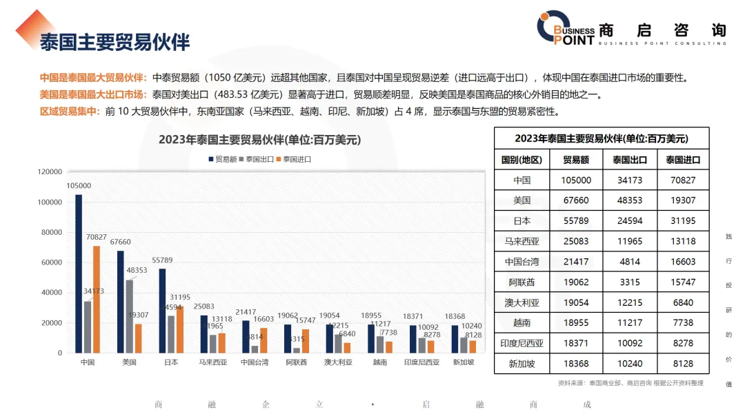 中国是泰国最大贸易伙伴:中泰贸易额(1050 亿美元)远超其他国家,且泰国对中国呈现贸易逆差(进口远高于出口),体现中国在泰国进口市场的重要性。