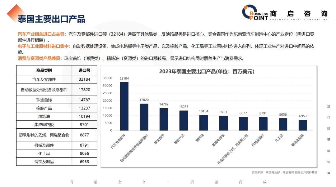 汽车产业相关进口占主导:汽车及零部件进口额(32184)远高于其他品类,反映该品类是进口核心,契合泰国作为东南亚汽车制造中心的产业定位(需进口零部件进行组装)。