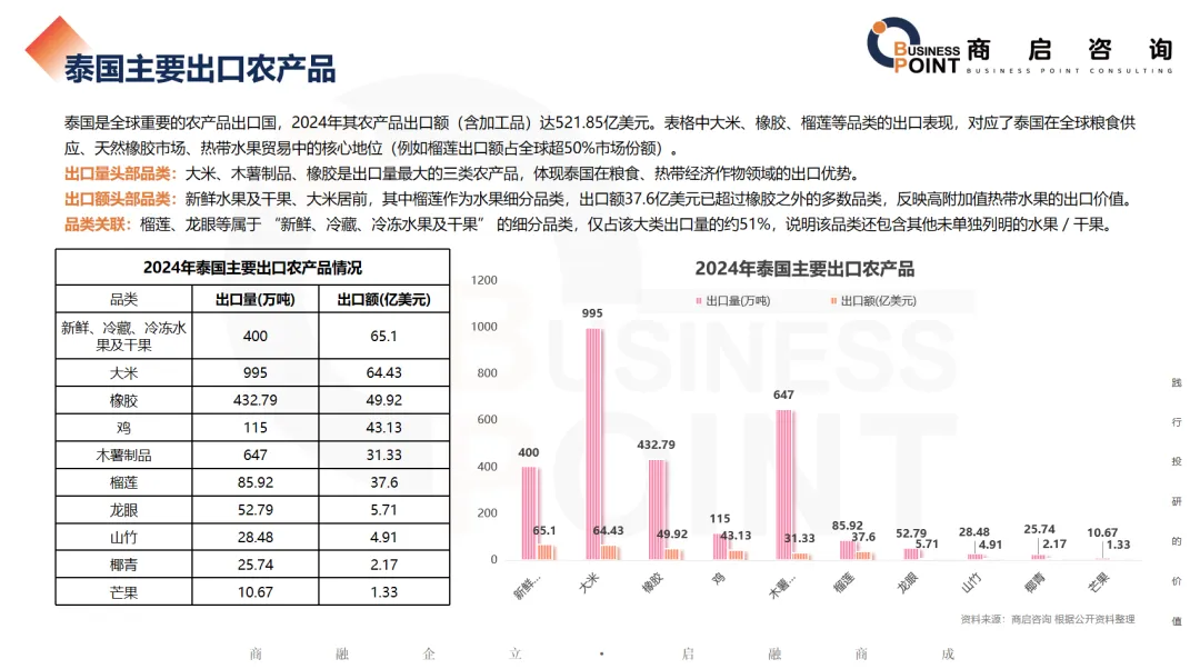 泰国是全球重要的农产品出口国,2024年其农产品出口额(含加工品)达521.85亿美元。表格中大米、橡胶、榴莲等品类的出口表现,对应了泰国在全球粮食供应、天然橡胶市场、热带水果贸易中的核心地位(例如榴莲出口额占全球超50%市场份额)。