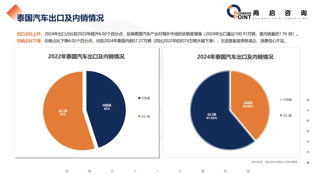 内销占比下滑:内销占比下降6.02个百分点,对应2024年泰国内销57.27万辆(同比2022年的约74万辆大幅下滑),主因是家庭债务高企、消费信心不足。