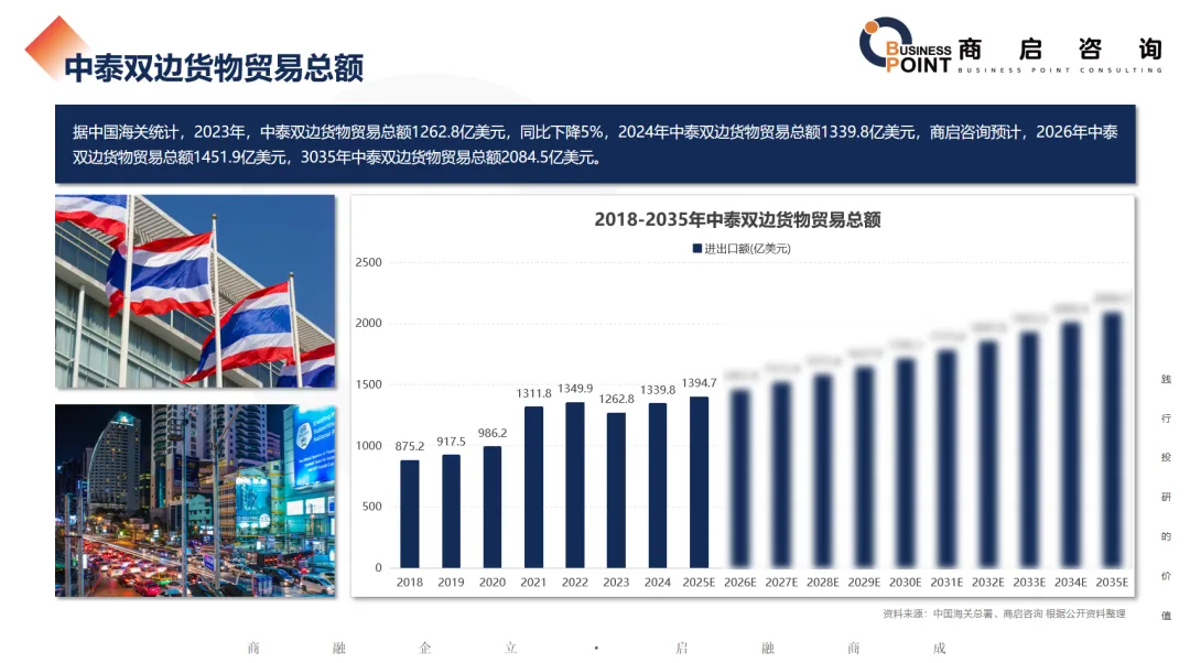 据中国海关统计,2023年,中泰双边货物贸易总额1262.8亿美元,同比下降5%,2024年中泰双边货物贸易总额1339.8亿美元,商启咨询预计,2026年中泰双边货物贸易总额1451.9亿美元,3035年中泰双边货物贸易总额2084.5亿美元。