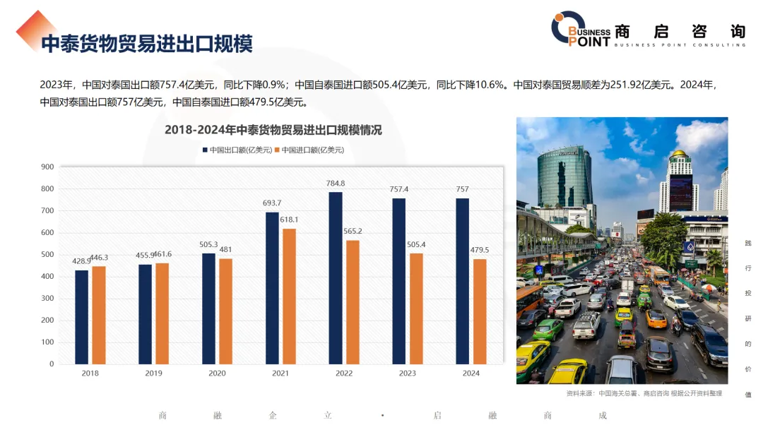 2023年,中国对泰国出口额757.4亿美元,同比下降0.9%;中国自泰国进口额505.4亿美元,同比下降10.6%。中国对泰国贸易顺差为251.92亿美元。2024年,中国对泰国出口额757亿美元,中国自泰国进口额479.5亿美元。