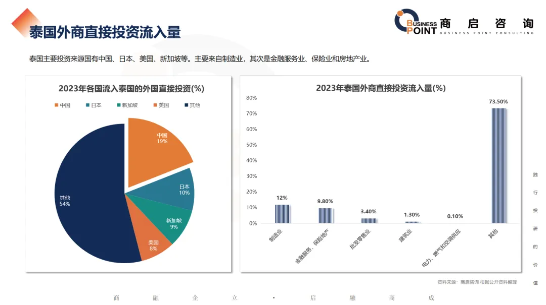 泰国主要投资来源国有中国、日本、美国、新加坡等。主要来自制造业,其次是金融服务业、保险业和房地产业。