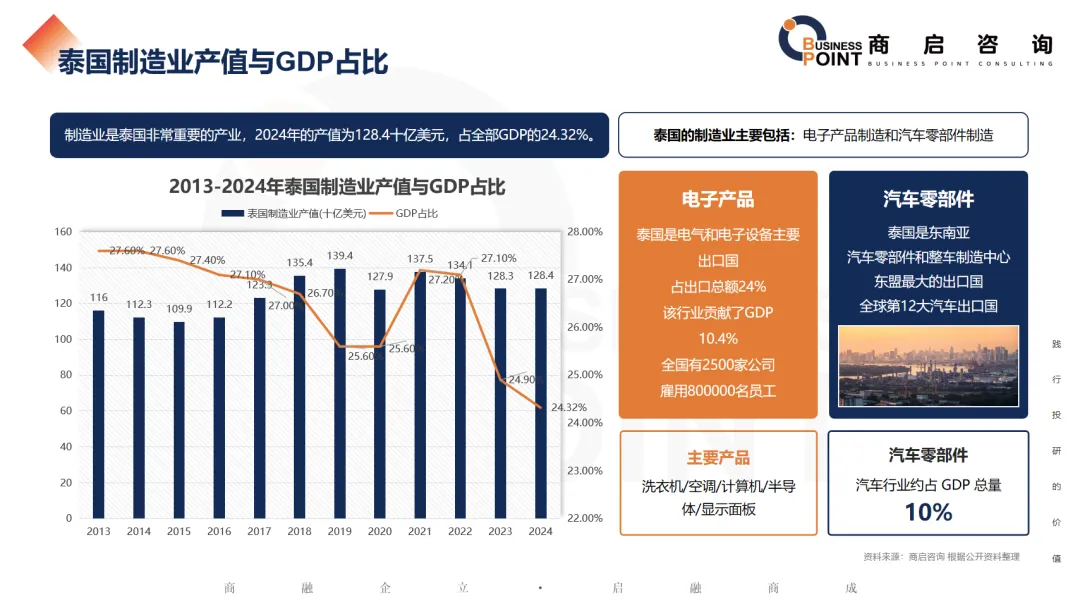 制造业是泰国非常重要的产业,2024年的产值为128.4十亿美元,占全部GDP的24.32%。