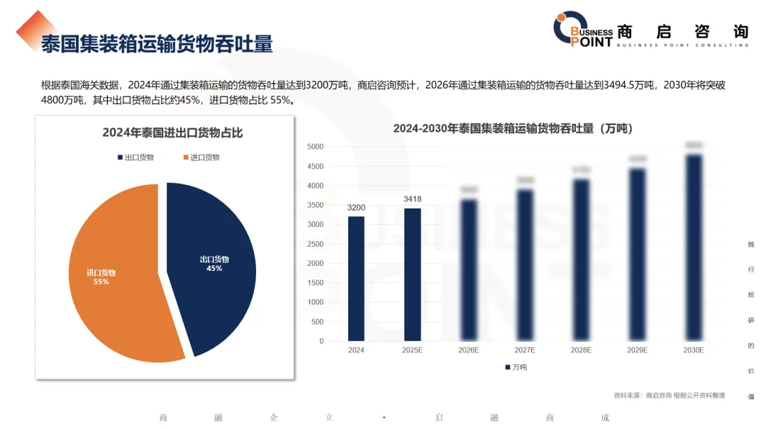 根据泰国海关数据,2024年通过集装箱运输的货物吞吐量达到3200万吨,商启咨询预计,2026年通过集装箱运输的货物吞吐量达到3494.5万吨,2030年将突破4800万吨,其中出口货物占比约45%,进口货物占比 55%。