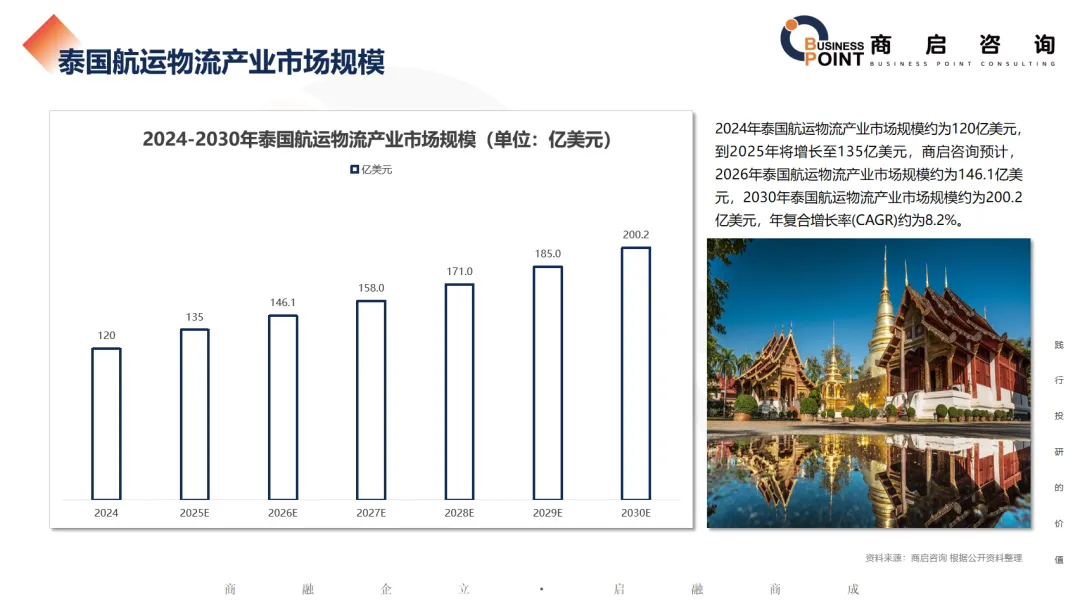 2024年泰国航运物流产业市场规模约为120亿美元,到2025年将增长至135亿美元,商启咨询预计,2026年泰国航运物流产业市场规模约为146.1亿美元,2030年泰国航运物流产业市场规模约为200.2亿美元,年复合增长率(CAGR)约为8.2%。