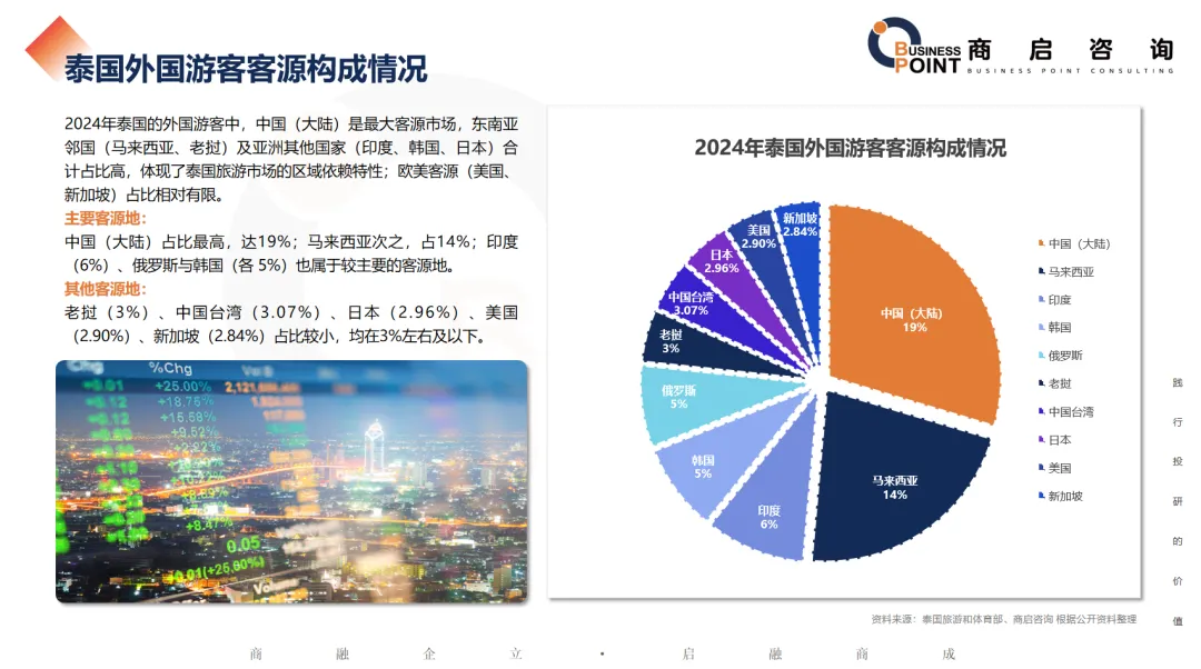 2024年泰国的外国游客中,中国(大陆)是最大客源市场,东南亚邻国(马来西亚、老挝)及亚洲其他国家(印度、韩国、日本)合计占比高,体现了泰国旅游市场的区域依赖特性;欧美客源(美国、新加坡)占比相对有限。